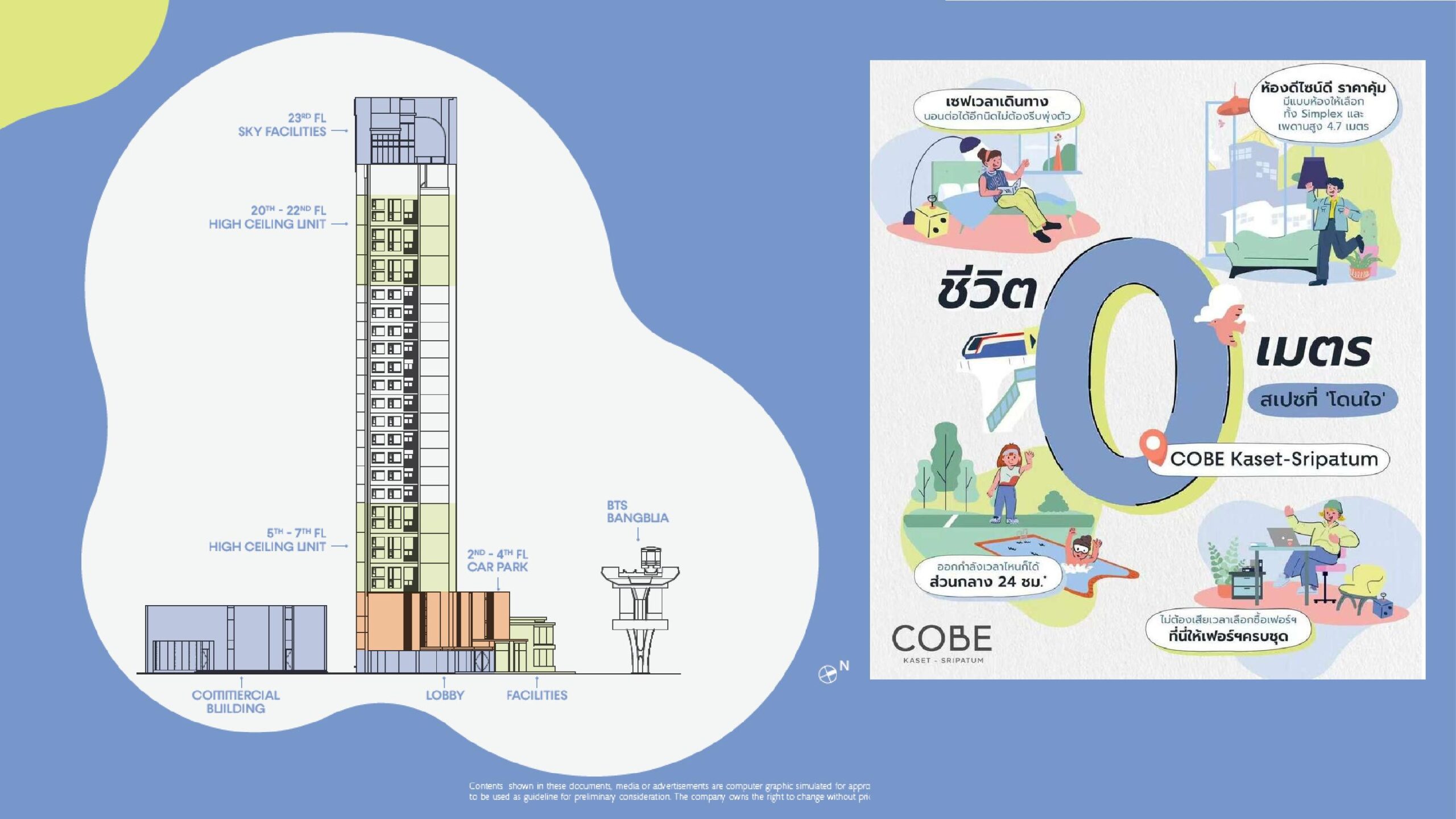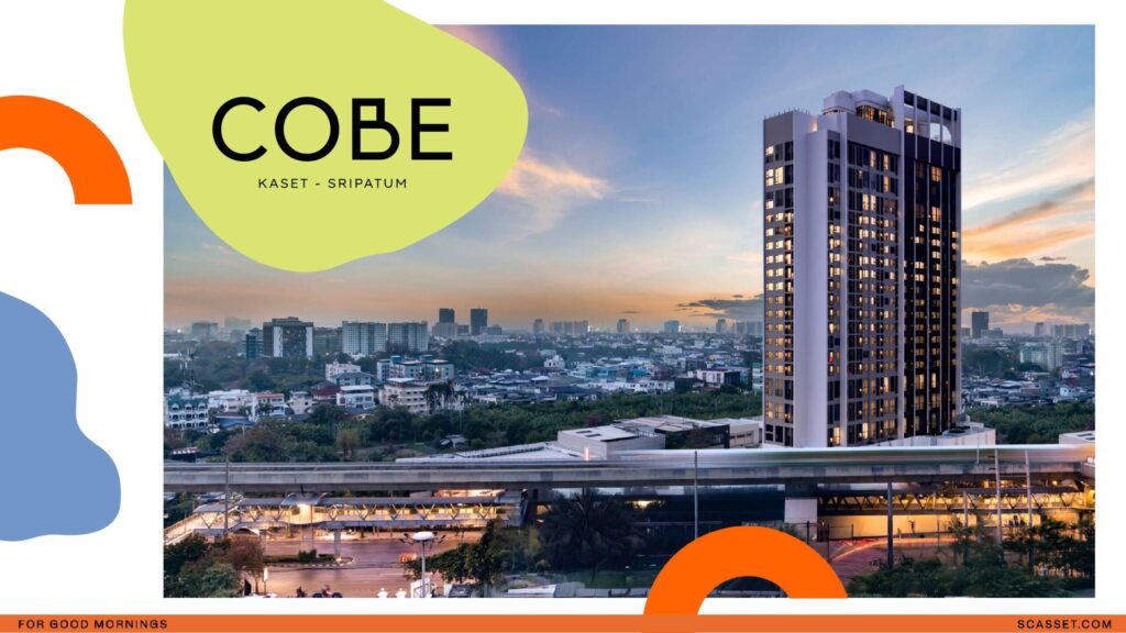 COBE Kaset-Sripatum พัฒนาโดย SC Asset บนพื้นที่ 4,310 ตร.ม. ประกอบด้วยอาคารพักอาศัย 23 ชั้น พร้อมอาคารพาณิชย์ 2 ชั้น รวม 401 ยูนิต (396 ที่พัก + 5 พาณิชย์) ที่จอดรถ 145 คัน (36.62%)