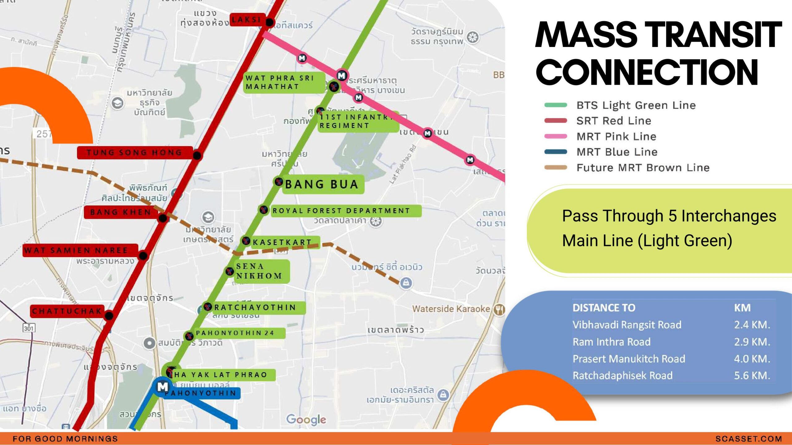 COBE ตั้งอยู่ 0 เมตรจากสถานี BTS บางบัว (N15) บนสายสีเขียวอ่อน เส้นทางหลักที่เชื่อมต่อ 5 อินเตอร์เชนจ์สำคัญทั่วกรุงเทพฯ ทั้ง SRT Red Line, MRT Pink Line, MRT Blue Line และ Future MRT Brown Line ในอนาคต