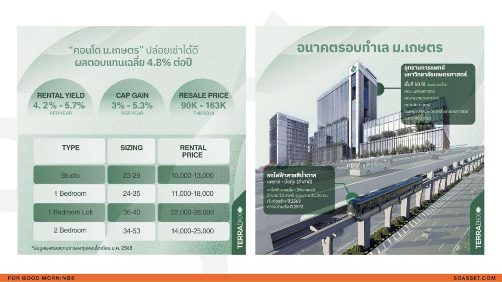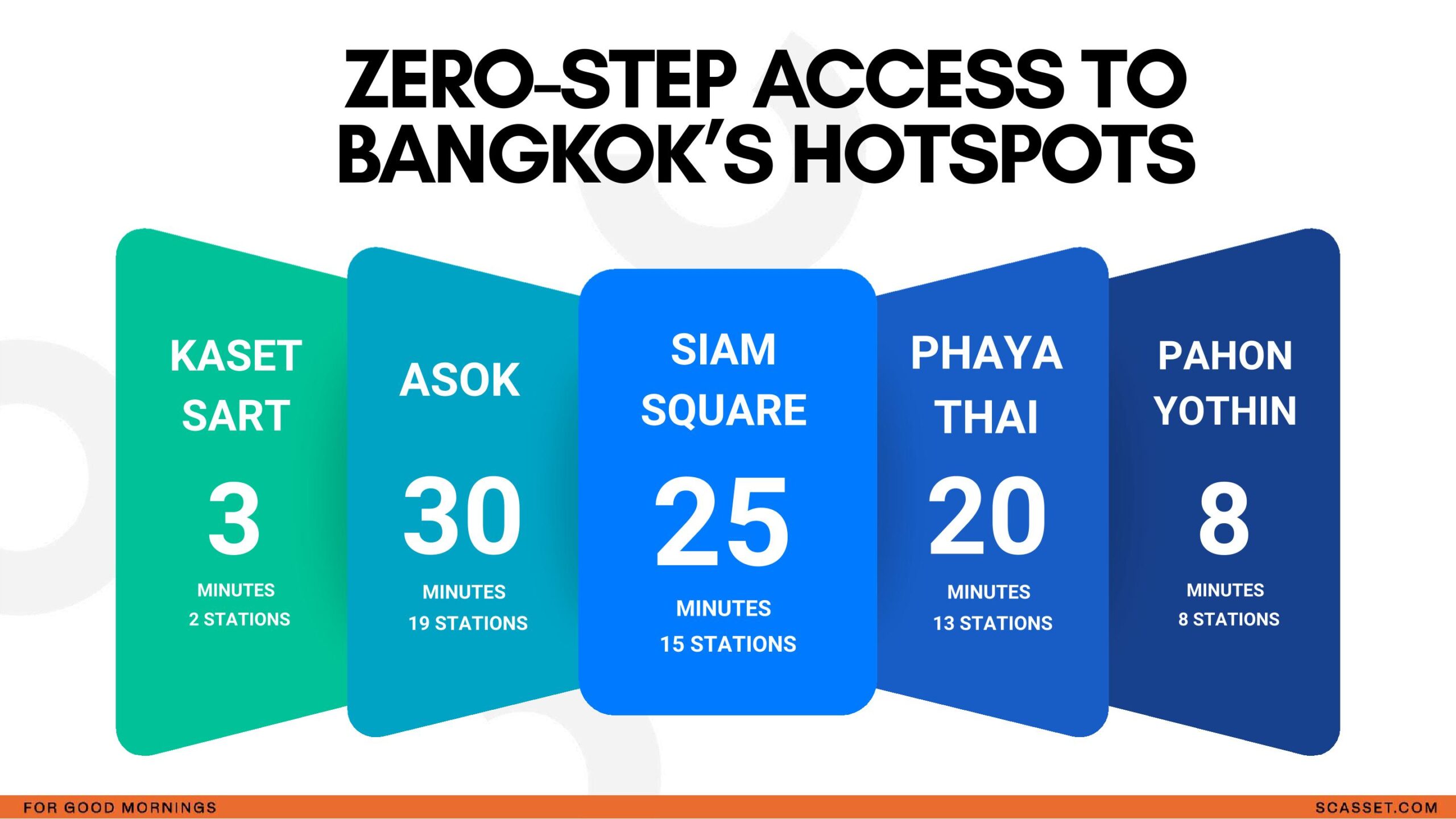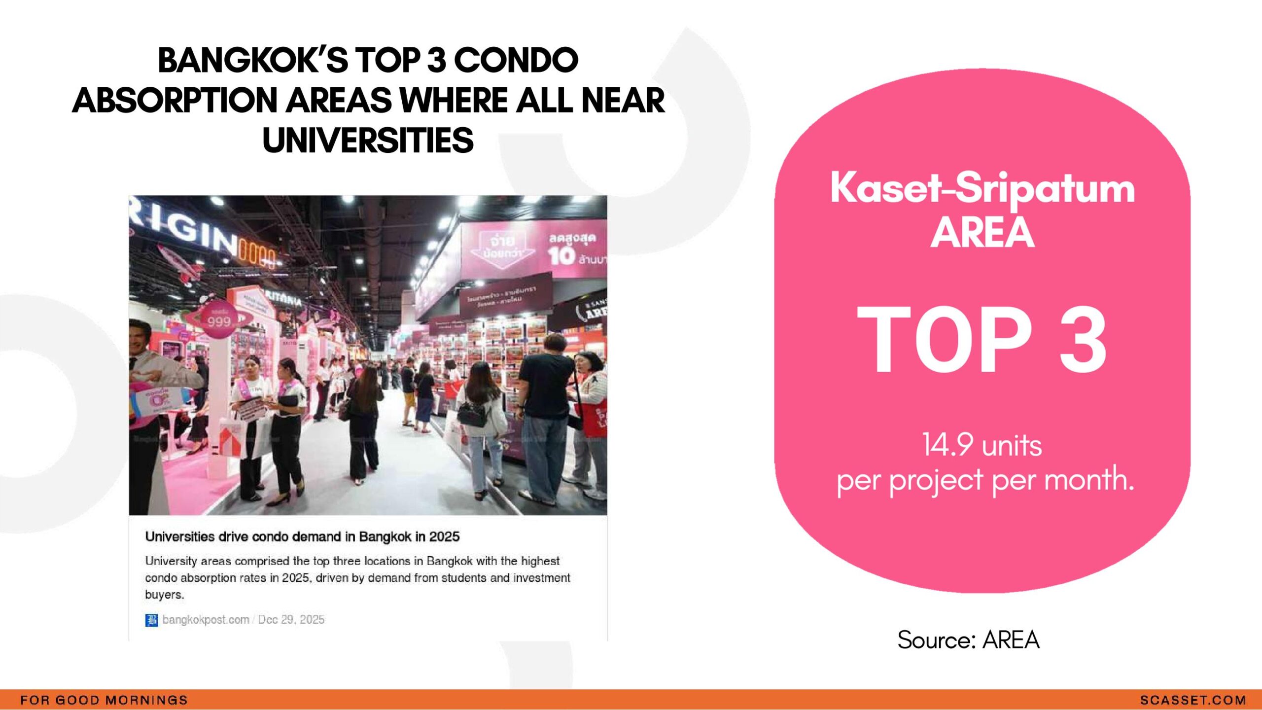 ยิ่งไปกว่านั้น ข้อมูลจาก AREA ยังยืนยันว่า Kaset-Sripatum ติดอันดับ Top 3 ทำเลคอนโดที่ร้อนแรงที่สุดในกรุงเทพฯ ด้วยตัวเลข 14.9 ยูนิตต่อโครงการต่อเดือน และมีมหาวิทยาลัยชั้นนำถึง 4 แห่งอยู่ในระยะ 2 สถานีรถไฟฟ้า