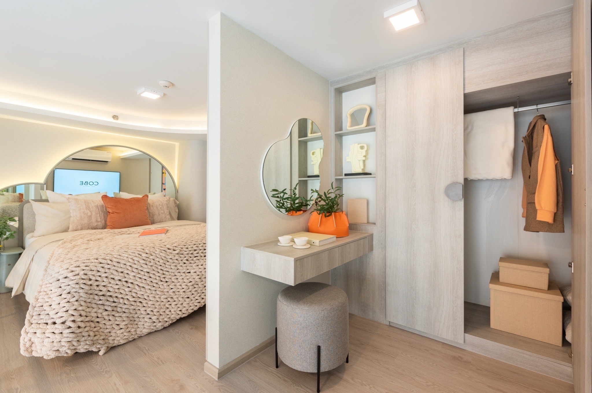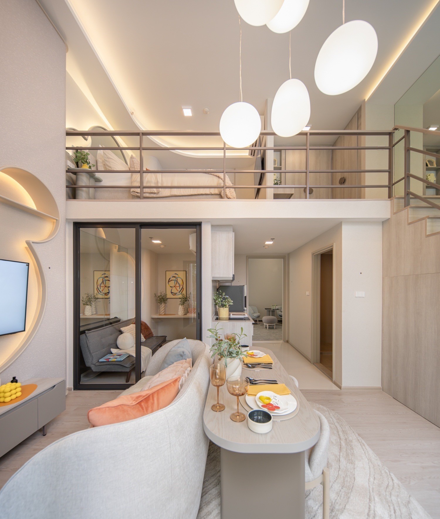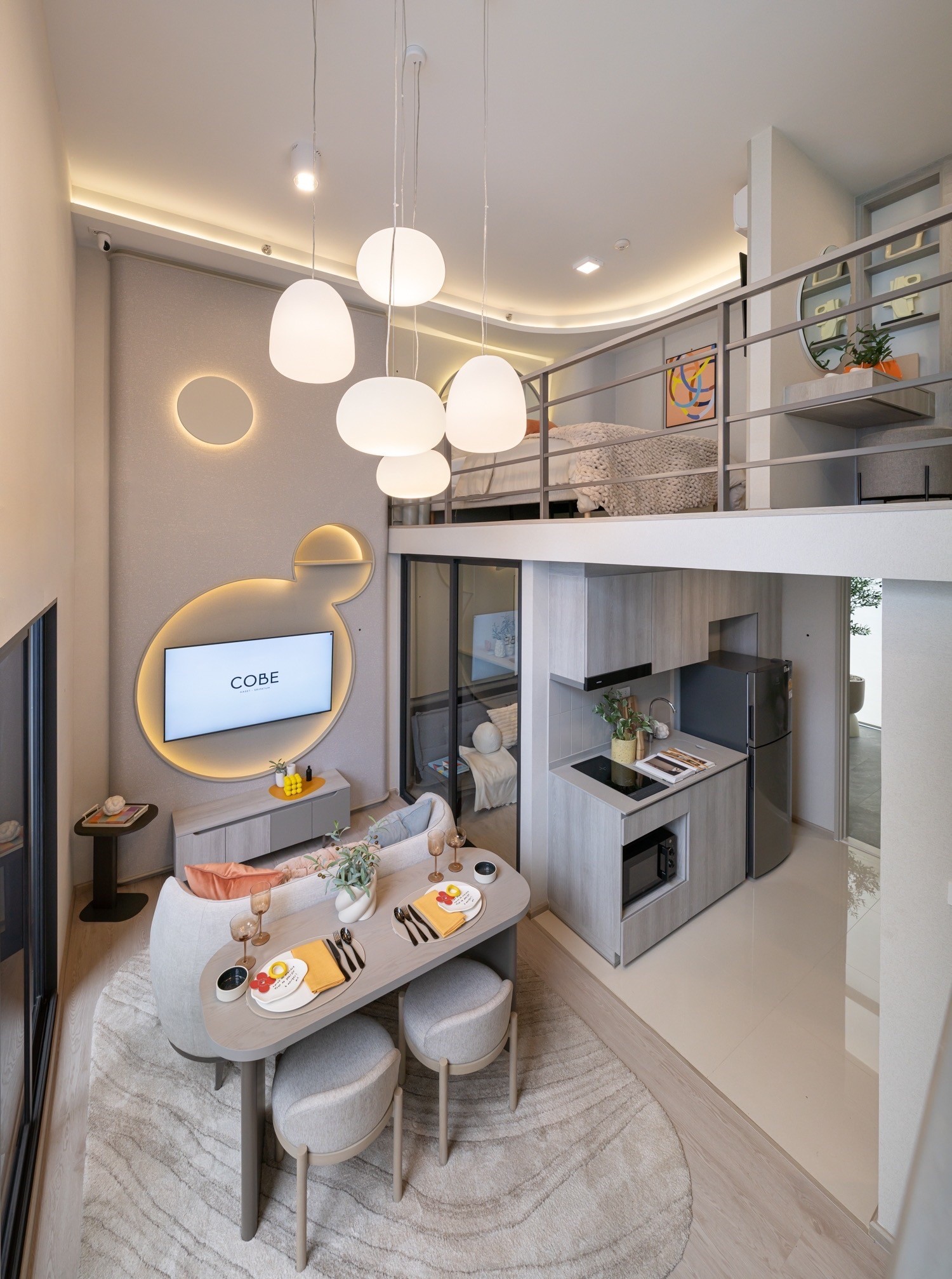 ห้องที่โดดเด่นที่สุดคือ High Ceiling Unit ที่อยู่ในชั้น 5–7 และ 20–22 มีทั้งแบบ Simplex และ Duplex เพดานสูงกว่า 4.7 เมตร ให้ความรู้สึกเหมือนอยู่อพาร์ตเมนต์หรู ในราคาคอนโดทั่วไป — นี่คือสิ่งที่ทำให้ COBE แตกต่างจากโครงการอื่นในย่านเดียวกัน